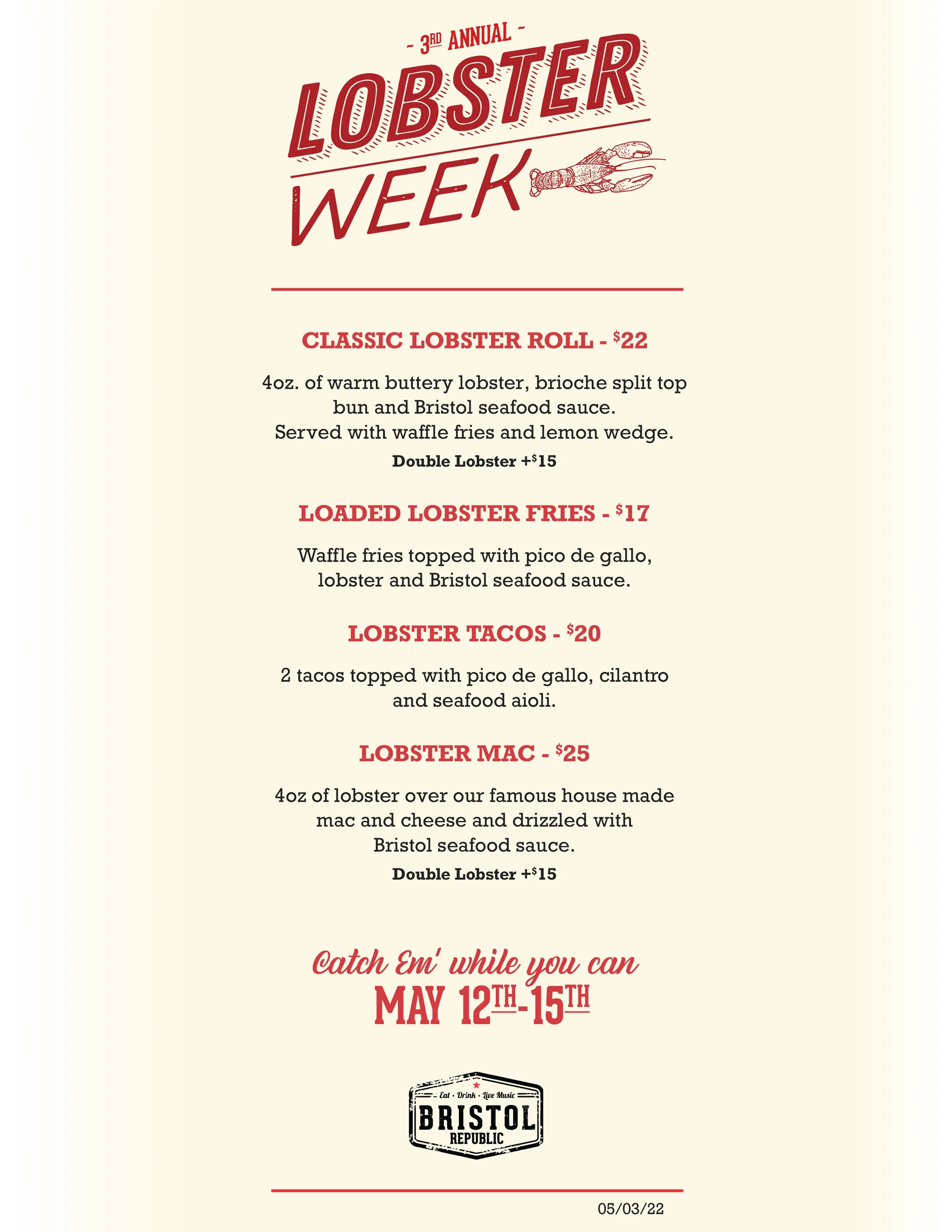 menusAll BBQ is smoked in-house daily, using our local BBQ partner Smoked on High’s secret award winning techniques and recipes Lobster Week Dinner Drinks Brunch happy hour Thursday $1 Dogs Good Time Service